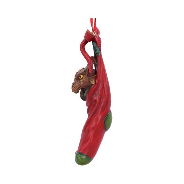 From world-renowned gothic and fantasy artist Anne Stokes, comes this Magical Arrival Hanging Ornament. Sitting snug inside a red stocking, this sneaky dragon peers over the edge wondering where all his presents have vanished to. Cast in the finest resin before being experty hand-painted this hanging ornament will sure be a festive favourite.