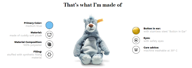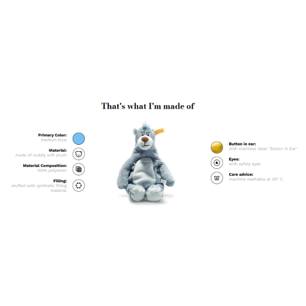 Eeyore from the Hundred Acre Wood is possibly the most slow-paced donkey in the world and will capture any child’s heart. He’s a somewhat perplexed donkey who lives in a ramshackle stick house but he’s surrounded by loyal friends with wonderful ideas. Let your imagination run wild – measuring 25 cm tall, our bluish-grey Disney Originals Eeyore is made of cuddly soft plush and loves to listen to you! He has long lop ears which are pink on the inside. And his little black button eyes go beautifully with his strokably soft, short black mane. His eyebrows, nostrils and mouth are all embroidered, and a magnificent white belly and round snout complete the look perfectly. Unlike in the films, your Eeyore can wag his pretty tail without fear of it falling off! All of this makes him a popular companion. Eeyore is part of a series of new Steiff cuddly toys with a Disney licence. And we’re proud of this! What makes me special?