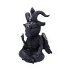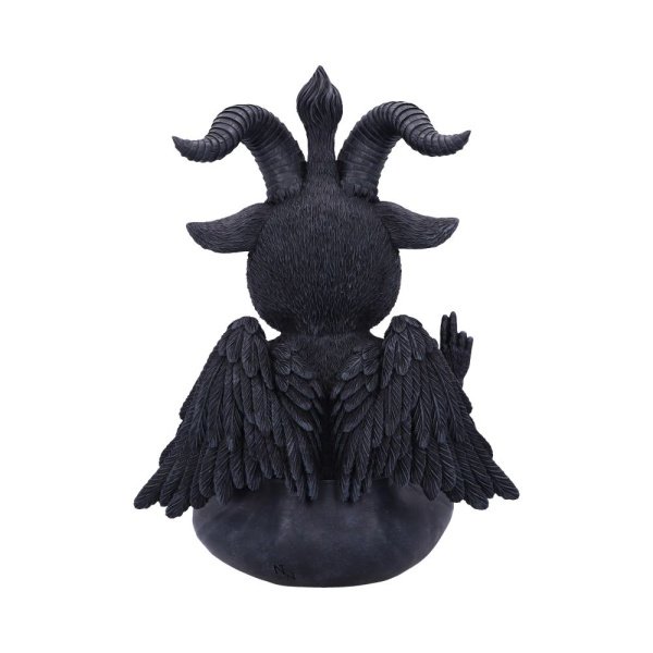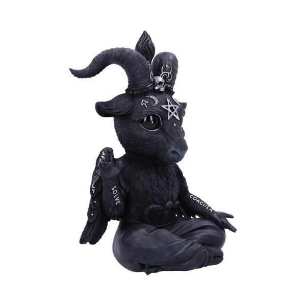 Sitting cross-legged, this Baby Baphomet sits, symbolizing the sum total of the universe. Legs ending in cloven hooves, the staff of Asclepius rises from their crotch. Their right arm is raised in a magical blessing with the word SOLVE (Separate) written on their forearm, while its left arm is stretched downwards and outwards invitingly, forearm bearing the word COACULA (Join Together). Their triple-horned goat head stares directly forwards as their wings stretch out behind them. Cast in high-quality resin and carefully hand-painted this figurine is likely to be the cutest occultist you’ve ever seen.,Cult Cutie Baphomet Figurine.,Size 30cm.,Cast in the finest resin.,Expertly hand-painted.,