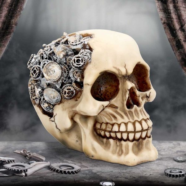 From the front, the skull looks both realistic and human however when turned you can see that it has been covered in arcane and mysterious mechanisms. Small cogs, gears and workings adorn the sides and makes the viewer wonder what let to such modifications. Cast in the finest resin before being carefully hand-painted, this skull is an essential part of any Gothic, Fantasy or Steampunk collection.,Steampunk skull,Cast in the finest resin,Expertly hand-painted,Size 15cm,