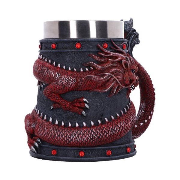 Drink deeply of a rich fantasy world with this enchanting Dragon Coil Tankard. Designed with a red onyx Dragon wrapped around the entirety of the tankard, jealously guarding the red jewels and your precious drink. From the side of the cup, the dragon’s tail curls up, creating the handle and adding to the second to none detailing of the piece. With a removable stainless steel insert for ease of cleaning, this goblet makes a mysterious and enticing addition to any home.,Beautifully crafted Dragon Tankard.,A fantastic addition to any kitchen.,Cast in high-quality resin.,Size 16cm.,
