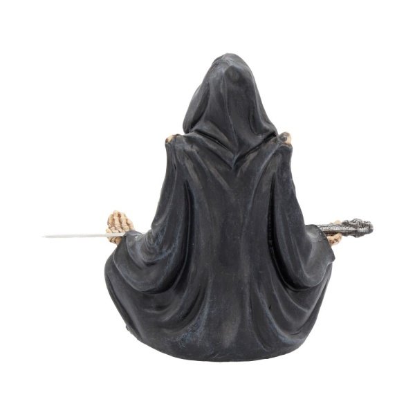 This figurine would make the ideal addition to any Corporate Goth’s office. Sitting, Cross-legged on the ground, this reapers cloak drapes down, showing his skeletal frame. Laying on his outstretched hands is a large sword, used for opening your letters! Cast in the finest resin before being expertly hand-painted, this piece will add a sinister aura to your space. ,Reaper figurine.,Cast in the finest resin.,Expertly hand-painted.,Size 15cm.,