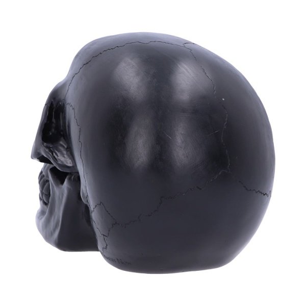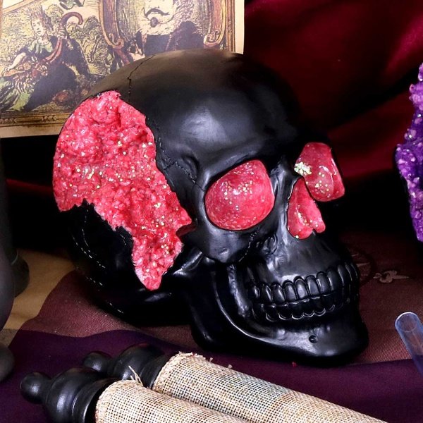 The most unassuming facade can hide the most scintillating interior. This matte black skull has eyes and nose holes that open up to a sparkling red world. A large crack at the side of the skull reveals an enchanting red crystal geode within, sparkling in the light. Cast in high-quality resin before being lovingly hand-painted, this skull makes a magical addition to any shelf.,Plain matte black skull complete with a sparkling red geode accent.,Red glittering eye sockets.,Cast in high-quality resin.,Painstakingly hand-painted.,