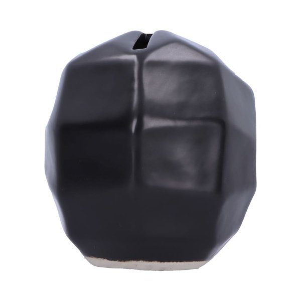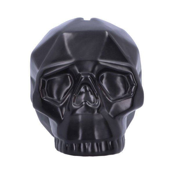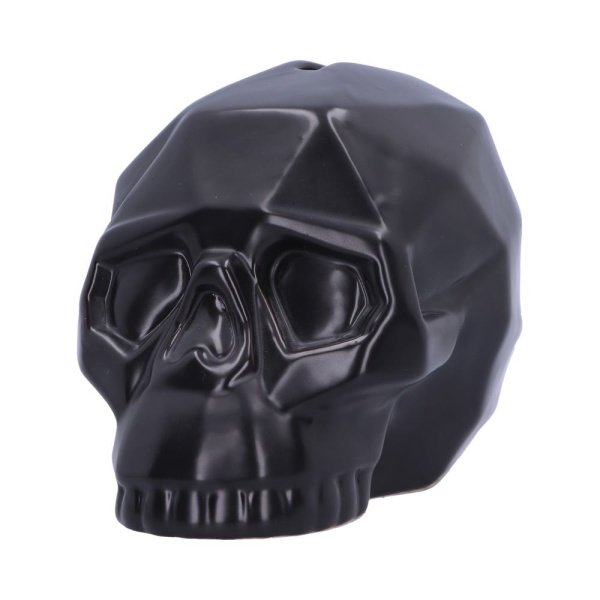 In the shape of a skull head, it has geometric like concaves surrounding the skull. A rectangular hole sits at the top of the skull to insert your money. Made from ceramic with a jet black finish, this Geometric Money Box is ideal for any gothic lover. ,Black geometric skull,Money box,Made from ceramic,Size 11.6cm,