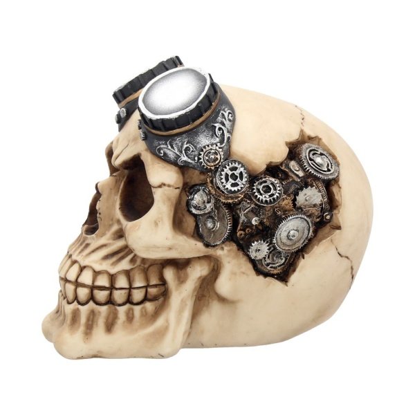 From the front, the skull looks both realistic and human. Wearing a large pair of Steampunk Goggles on his forehead, there is nothing to suspect however when turned you can see that it has been covered in arcane and mysterious mechanisms. Small cogs, gears and workings adorn the sides and makes the viewer wonder what let to such modifications. Cast in the finest resin before being carefully hand-painted, this skull is an essential part of any Gothic, Fantasy or Steampunk collection.,Steampunk skull,Cast in the finest resin,Expertly hand-painted,Size 25cm,