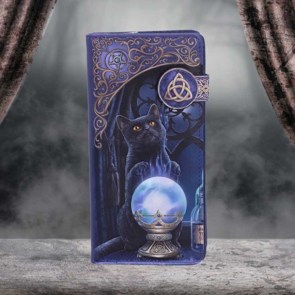 From the enchanted imagination of internationally recognized Fantasy artist Lisa Parker, this stylish and practical purse was created by alternative brand Nemesis Now. In front of a Gothic arched window, with the moon shining in, a black cat stands on their hind legs. Surrounded by potion bottles, their front paws hover over a glowing crystal orb. Their orange eyes look curiously at the sparks of magic floating up in front of them as they weave enchantments. This portable purse is large enough to keep your money and cards secure, but small enough for any pocket or handbag, making it perfect for the witches’ apprentice on the go.