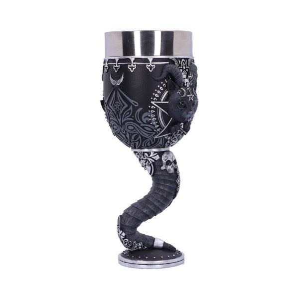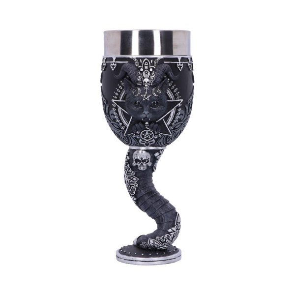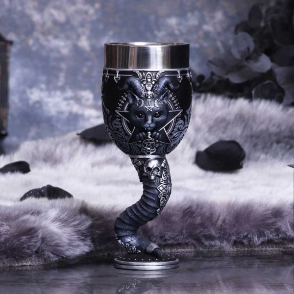This Pawzuph Goblet is the union of good and evil, as you look into its black eyes you notice the darkness that resides. Inside this cat appears to be the spirit of Baphomet, encapsulated by goat horns and satanic symbology. With ornate silver detailing and an s shaped stem this amalgamation of horror and delight will make the perfect addition to any feline fanatics collection.,Pawzuph Goblet.,Featuring Pawzuph who appears to be a spirit of Baphomet.,Carefully hand-painted.,Removable stainless steel insert.,