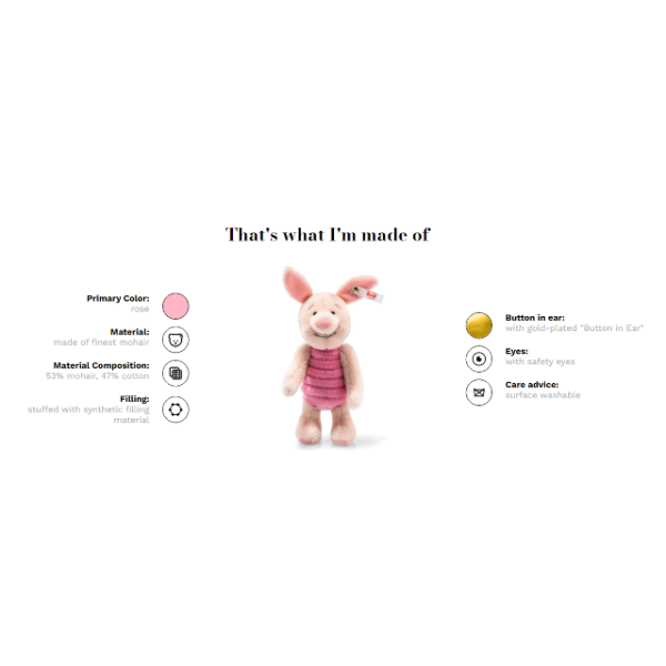 Piglet may be small, but his heart is huge. Although he sometimes appears afraid, he is often courageous when coming to the aid of others. Piglet is Pooh’s best friend — loyal and trustworthy. Steiff’s version of Miniature Piglet is made of finest mohair with “hand-stitched” details and 16 cm tall. Giftboxed with Certificate. What makes me special?