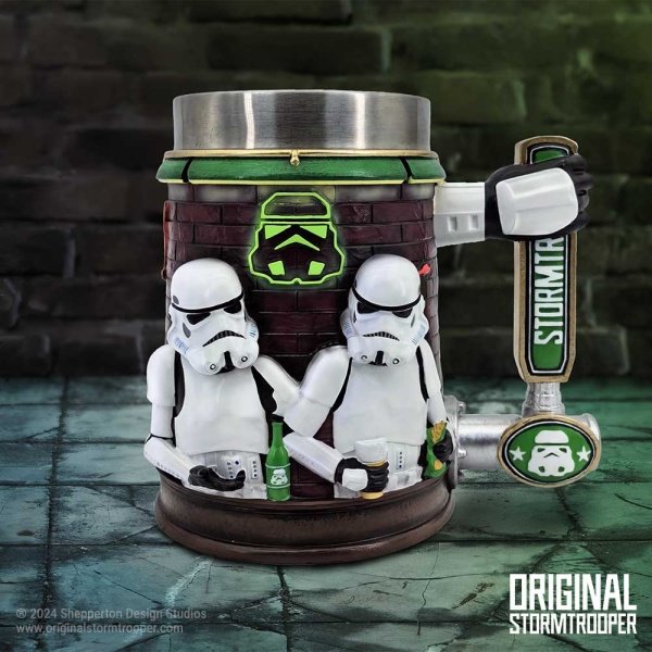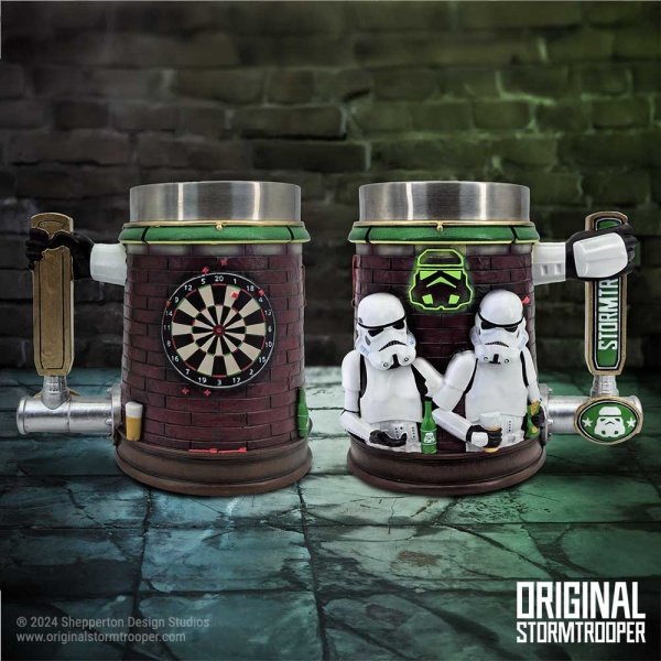 Known for their white suits and shocking aim, the Stormtrooper is easily noticeable by all! Here we can see two troopers taking a break from their duties to enjoy a well deserved pint. The Tankard handle mimics that of beer tap, whilst the background features typical pub accessories such as neon lights and a darts board. Cast in the finest resin before being expertly hand-painted, this Tankard will stand out on any collector’s shelf, and is ideal for enjoying your favourite beverage!,Officially Licensed Stormtrooper Merchandise,Stormtrooper Bar Tankard,Cast in the finest resin,Expertly hand-painted,