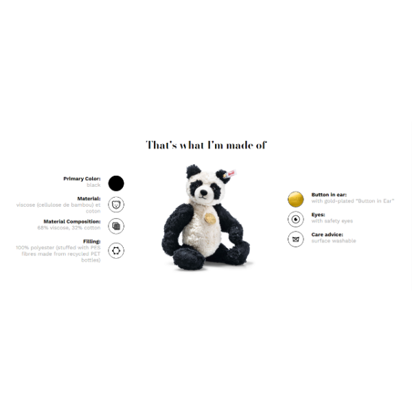 The first giant pandas arrived in America in 1937. Richard Steiff, then living in America, immediately began design work. Our Steiff archivist confirms that on 12.01.1938 the very first sample was recorded, making Steiff the first toy manufacturer to offer a panda. They have remained on the range ever since illustrating their popularity. Now Steiff heritage meets Steiff’s future. Please applaud Panda bear as he joins the “Teddies for tomorrow” Collection. Evander enjoys his alternative materials of woven plush made of soy bamboo viscose. His paw pads are also of soy bamboo viscose, and he is filled with PES fibres from recycled PET bottles. Evander is a glorious addition to this new series. Giftboxed with Certificate. What makes me special?