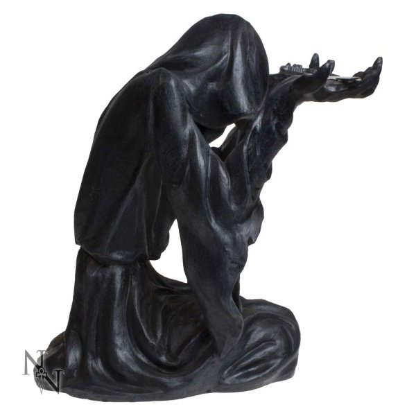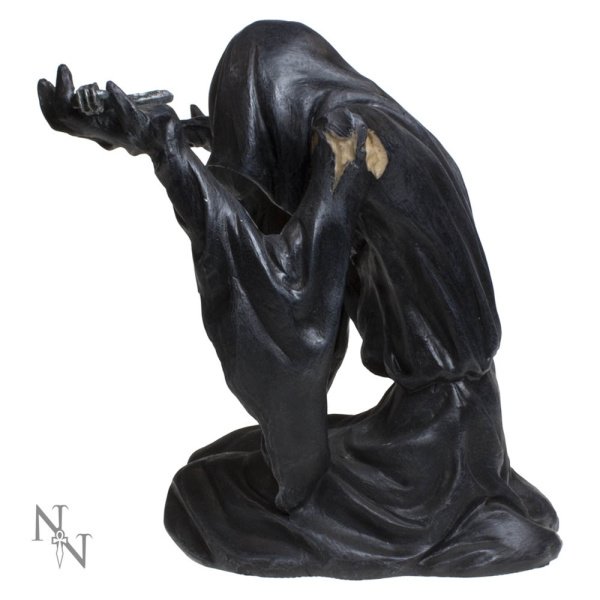 This dark Reaper rests, kneeling down while bowing his hooded head, arms raised upwards in submission. In his timid grasp, there is a small blade which can be used to open your most precious mail. His black cloak drapes down, hiding his skeletal face, giving this figure a sinister aura. Cast in the finest resin before being hand-painted, this piece would make a welcome addition to any Gothic home or office. ,Reaper figurine,Letter opener holder,Cast in the finest resin,Size 20cm,
