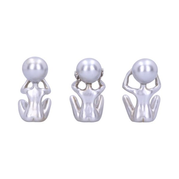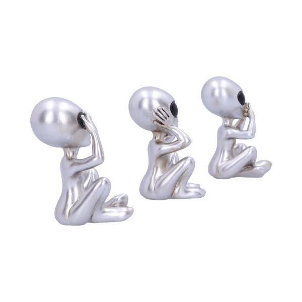 Sitting side by side these 3 silver aliens embody the ancient Confucian wisdom of “See no evil, hear no evil, speak no evil”. One covers their eyes, one their ears and one their mouth, these cheeky little silver friends will protect your store from any unwanted invaders. Cast in the finest resin before being painstakingly hand-painted, this galactic trio is exclusively available as part of Nemesis Now’s wholesale giftware range.,Three Wise Aliens Figurine.,Size 7.5cm.,Cast in the finest resin.,Expertly hand-painted.,